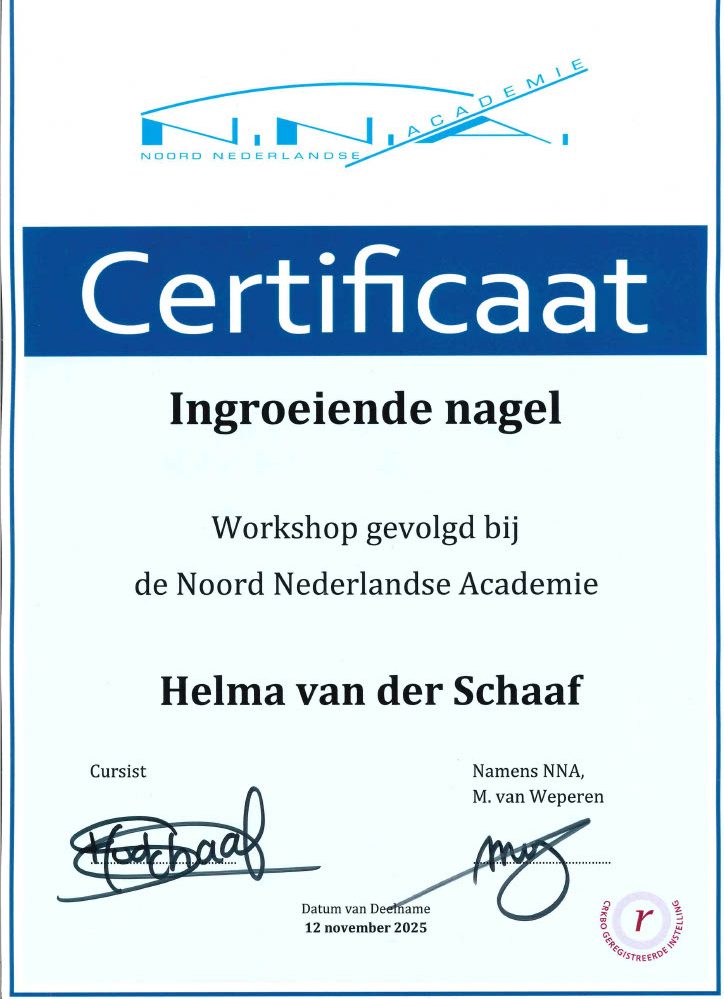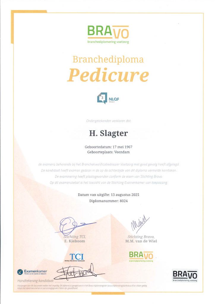 Op mijn 57e heb ik het roer omgegooid en ben ik in september 2024 begonnen met de opleiding basis pedicure. De opleiding heb ik in juli 2025 met succes afgerond.